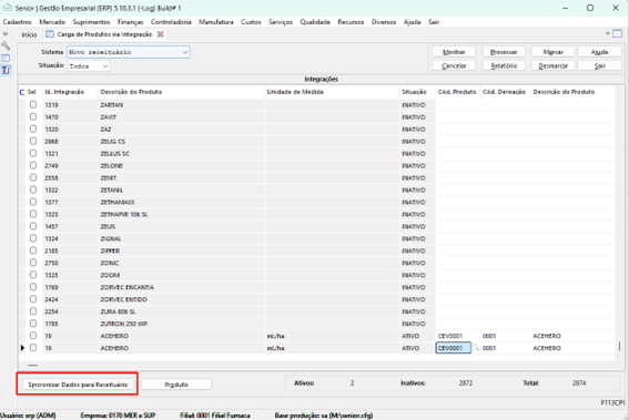 A integração de Bula e Aplicação só serão realizadas quando todos os produtos recebidos via integração estiverem relacionados com o cadastro de produto/derivação do ERP Senior (Situação Ativo).
