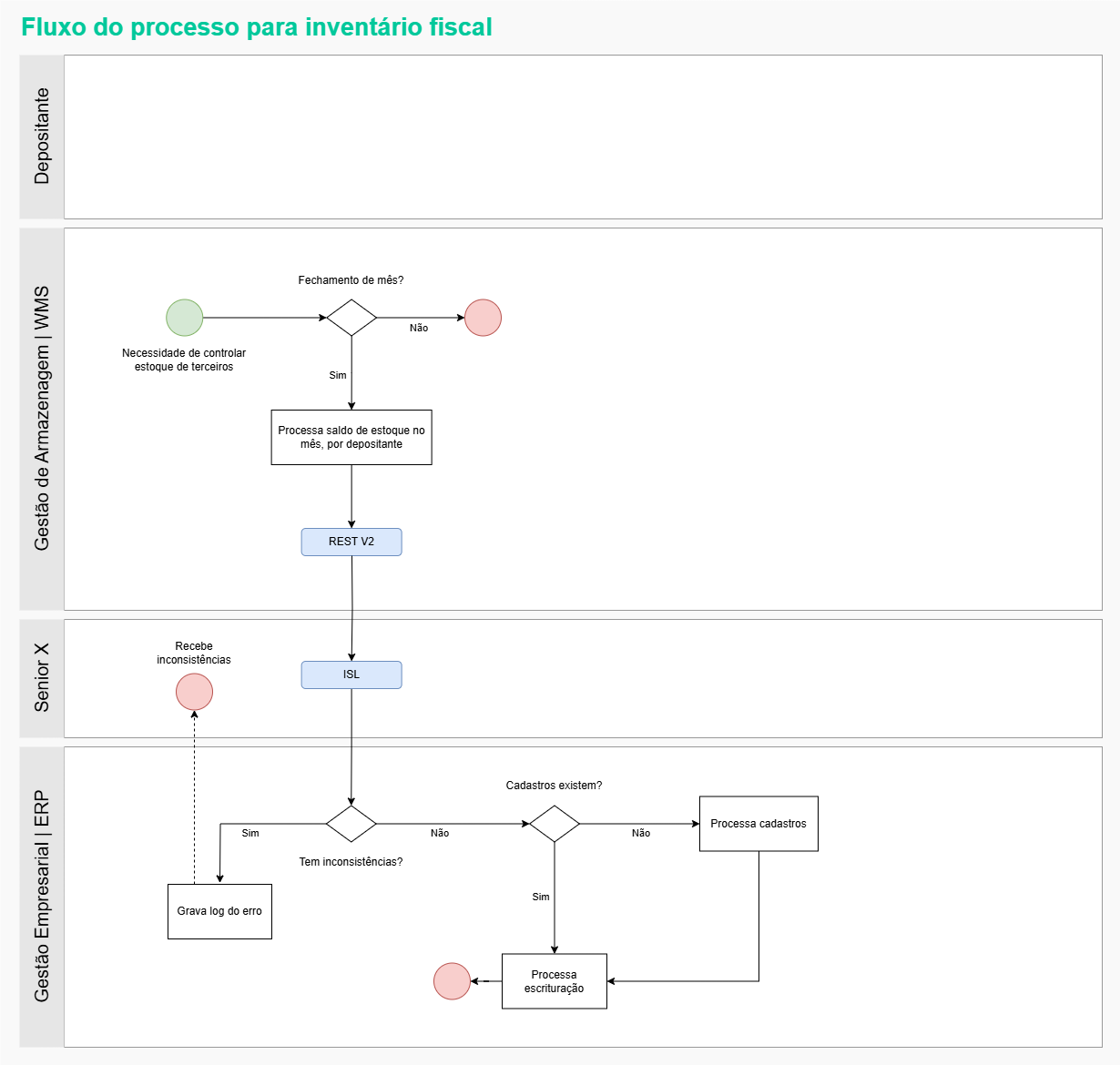 Processo de recebimento dos saldos de estoque físico iniciado pelo Gestão de Armazenagem | WMS, que integra com o Gestão Empresarial | ERP o saldo de estoque no mês, por depositante.