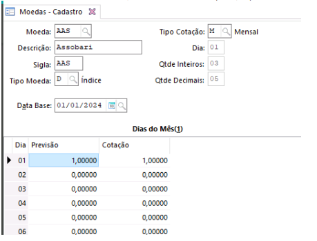 2. No campo Moeda, indique "AAS - Assobari Assistência Social", com valor fixo do índice em R$ 1,00;![]()