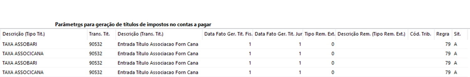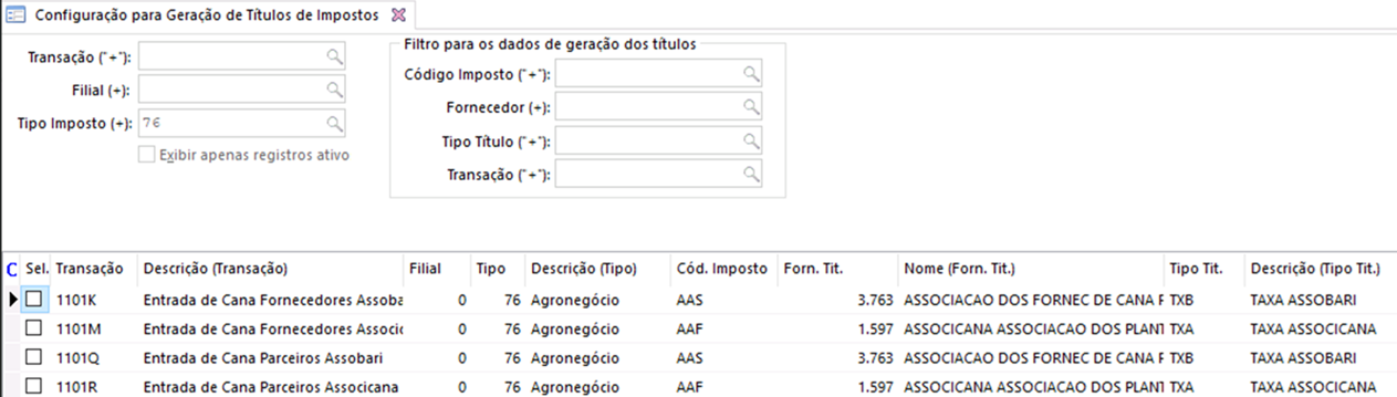 1. As taxas referentes ao processo devem gerar títulos nota a nota. Para configurar essa funcionalidade, acesse Cadastros > Transações > Parâmetros por Gestão > Configuração para geração de títulos de impostos (Compras/Vendas) (F001TIT)