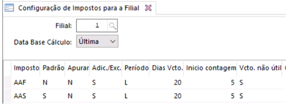 1. Para vincular os impostos cadastrados à filial, utilize a tela padrão do sistema "Configuração de impostos para a filial".