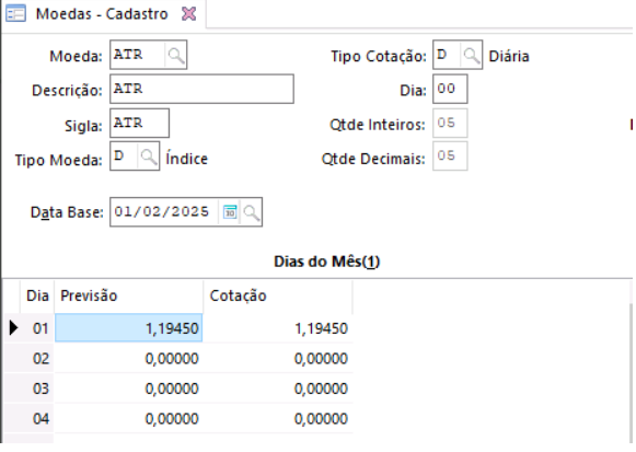 3. Selecione no campo Moeda "ATR - Taxa AAF (Associcana Assistência Fornecedor)", que utiliza como base a moeda ATR do estado de São Paulo e exige atualização mensal obrigatória;