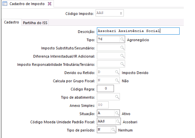 5. Preencha os campos da seguinte forma: em Código Imposto, informe "AAS"; em Descrição, indique "Assobari Assistência Social"; no campo Tipo, escolha "76"; e em Código Moeda Unidade Padrão Fiscal, indique "AAS";