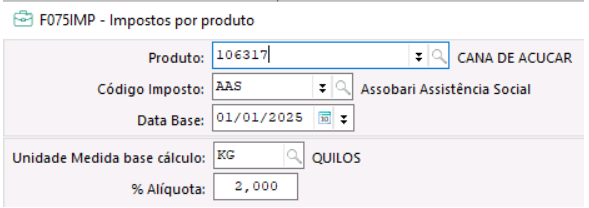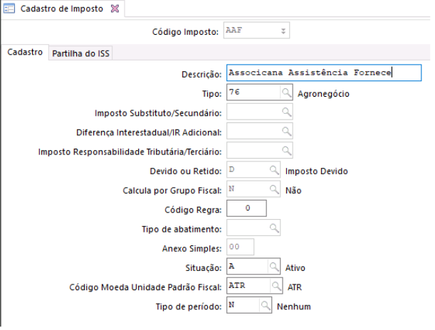 6. Próxima taxa, no campo Código Imposto, informe "AAF". Em Descrição, utilize "Associcana Assistência Fornecedor" e, no campo Código Moeda Unidade Padrão Fiscal, defina ATR.
