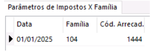 2. Ainda nessa tela, após vincular os impostos à filial, é necessário preencher a guia "Parâmetros de Impostos X Família" e informar: