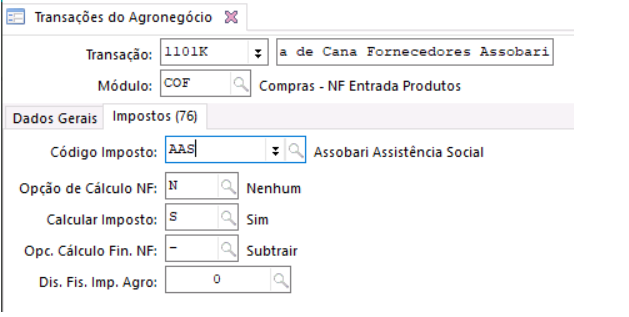Transação: 1101K – Entrada de Cana Fornecedores Assobari
