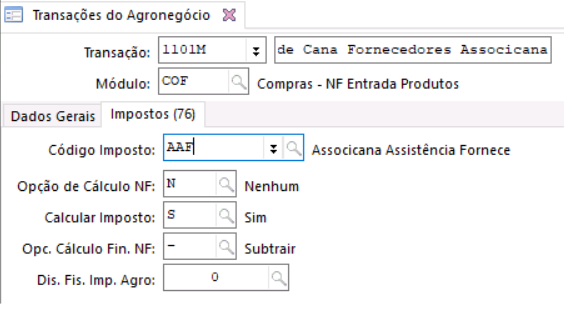 Transação: "1101M – Entrada de Cana Fornecedores Associcana";