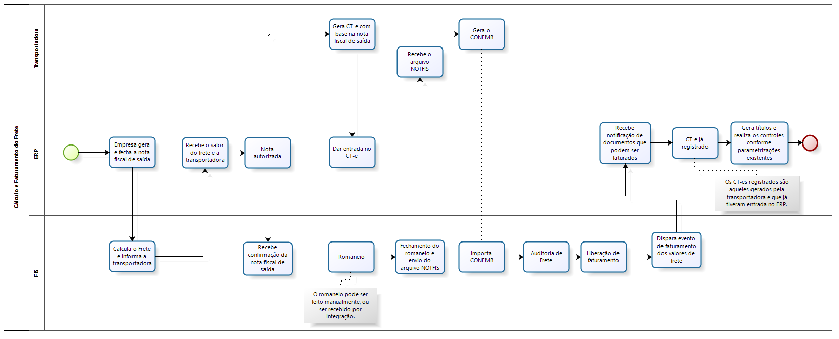 A integração do ERP (Gestão Empresarial | ERP) com a Gestão de Fretes | FIS permite que o cálculo do frete seja feito no FIS, assim como a confirmação do faturamento do frete, sendo enviado para que o ERP gere os títulos para as transportadoras e conclua o processo, conforme fluxo abaixo.