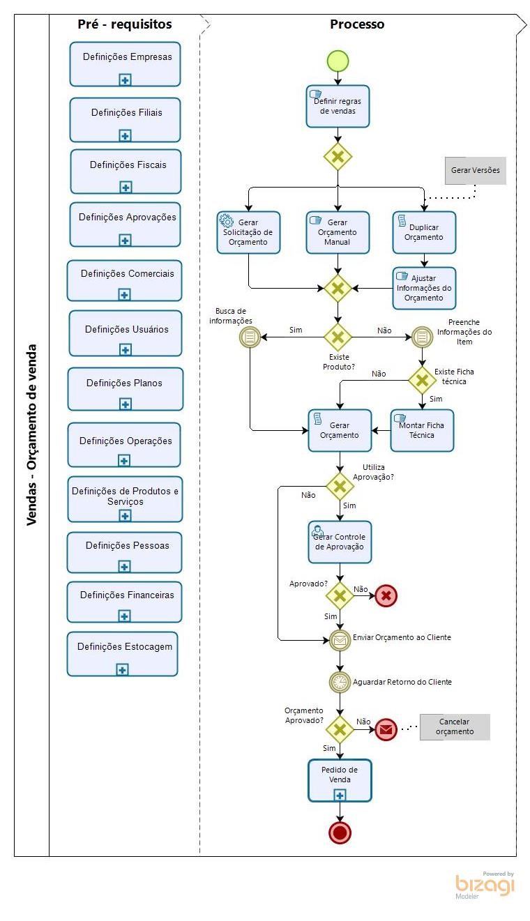 Os conceitos do processo de orçamento de venda garantem o objetivo de suprir a necessidade do cliente ao solicitar produtos e serviços. Estes conceitos são baseados no processo demonstrado pelo fluxo.