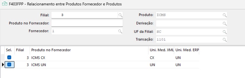 Caso no XML, o código do produto no fornecedor seja ICMS CX e ICMS UN e no ERP este produto seja o ICMS, essa variação pode ser cadastrada da seguinte forma: