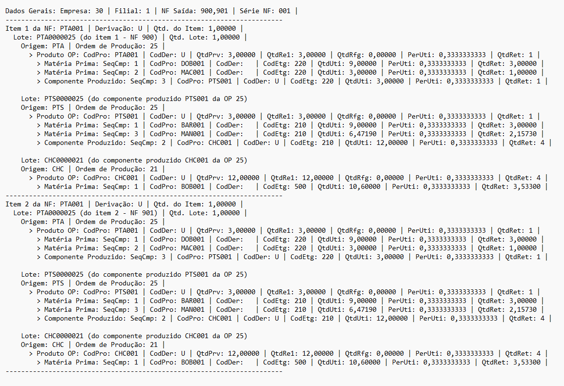 Após estas informações mostra os itens de cada nota fiscal de industrialização, com os lotes usados pelo faturamento do produto do item da nota. Em seguida, mostra as ordens de produção que produziram cada lote, com informações do produto da ordem e seus componentes, que podem ser matéria prima e componente produzido. Para cada componente produzido são localizadas as ordens de produção usadas na sua produção, através do lote usado pelo componente produzido.