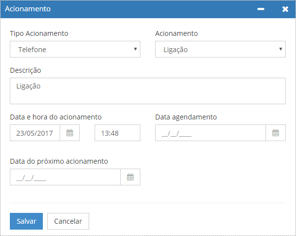 No campo Acionamento escolha como ocorreu o acionamento do cliente, de acordo com o Tipo de acionamento (Telefone, Carta/E-mail, Visita ou Outros) selecionado previamente.