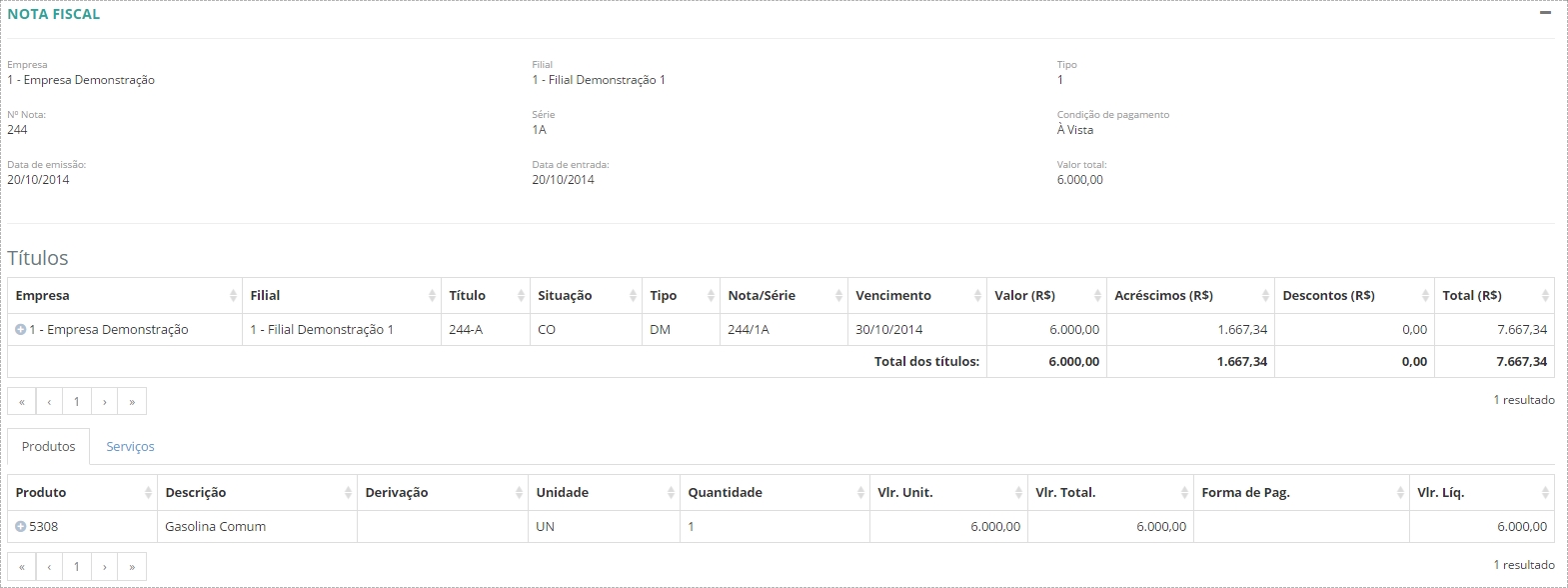 Você pode consultar os dados da nota fiscal que originou o título, basta clicar sobre o link da coluna Nota/Série. Neste caso, são exibidas as informações gerais da nota fiscal, bem como os títulos gerados e os produtos e serviços que foram vendidos. Para os títulos da nota fiscal, ainda é possível verificar os detalhes de cada um. Quando não houver nota fiscal, a coluna é exibida em branco.