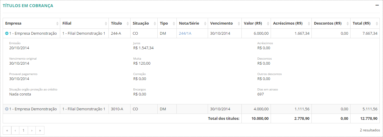 A relação dos títulos em cobrança é exibida para consulta, sendo possível expandir os detalhes de cada um deles. Dessa forma, pode-se verificar a data de emissão do título, a data do provável pagamento, o valor dos juros, os dias em atraso, entre outras informações relevantes.