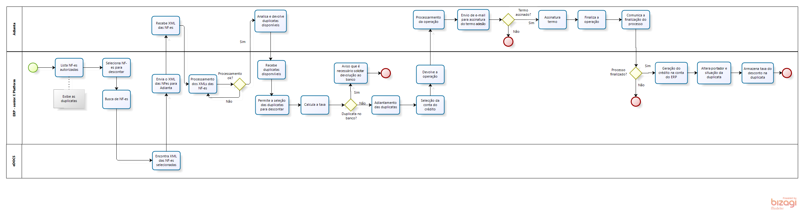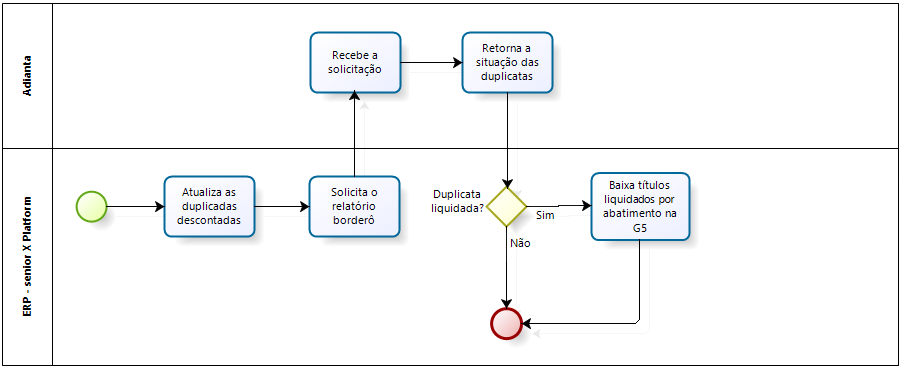 Com a confirmação da assinatura do borderô, o sistema Adianta acessa a Senior X e realiza a transferência dos valores adiantados pela conta interna, altera o portador e a situação dos títulos enviados.