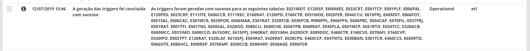 Neste momento, serão apresentadas duas notificações, uma indicando se o processo foi concluído com sucesso e outra informando a criação das triggers. Essas notificações são sempre por módulo.