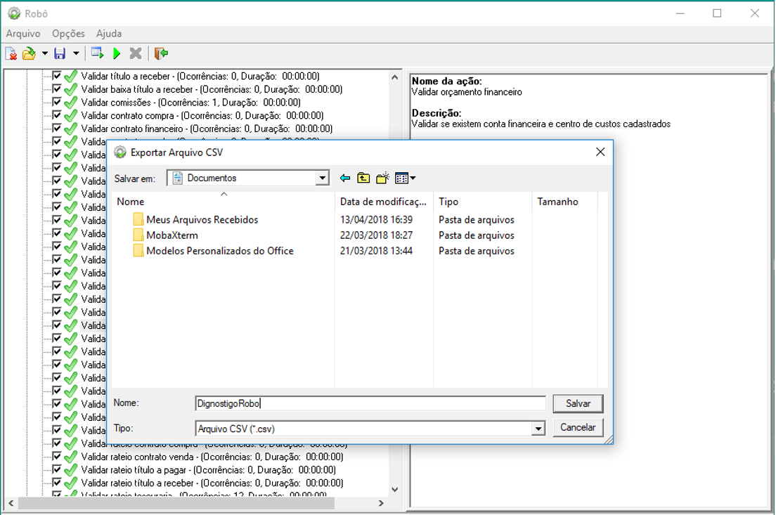 - Selecione o local, informe o Nome do arquivo que deve ser criado com a extensão .csv, e clique em Salvar;