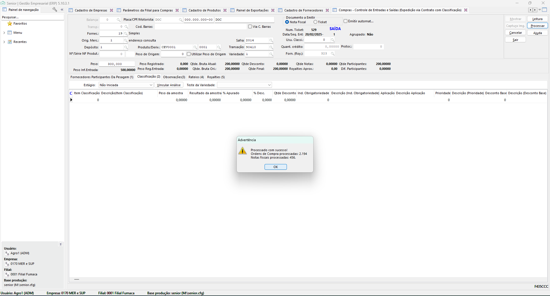 - Via balança, através da tela Compras - Controle de Entradas e Saídas (Expedição via Contrato com Classificação) (F435CCC), selecionando a opção Nota Fiscal e realizando a entrada e saída da balança. Ao processar com sucesso, é automaticamente criada uma integração enviando os dados da pesagem para o Hub de Royalties em tempo real;