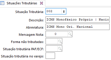 - A situação tributária de ICMS deve ser 02. Para cadastrá-la, acesse a tela Situações Tributárias (F027STR)
