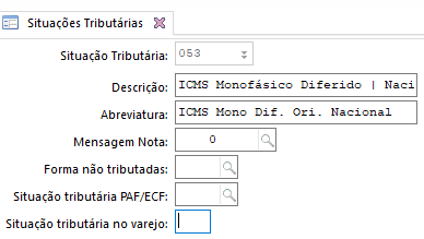 - Utilizar uma das situações tributárias do ICMS Monofásico (02, 15, 53 ou 61). Para cadastrá-las, acesse a tela de Situações Tributárias (F027STR)