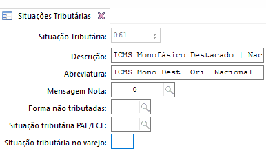 - A situação tributária de ICMS deve ser 61. Para cadastrá-la, acesse a tela Situações Tributárias (F027STR)