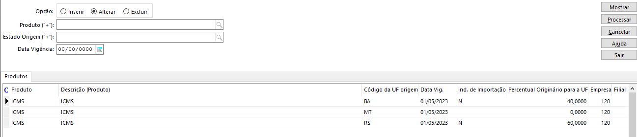 - No exemplo abaixo, serão gerados registros para os estados da BA e do RS, pois para o estado do MT falta o indicativo de importação e o percentual originário para a UF: