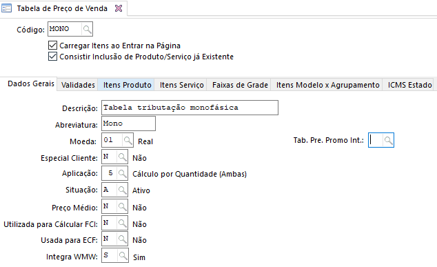 - O produto deve ter uma tabela de tributação de ICMS Monofásico cadastrada válida e com aplicação 3 ou 5 para operações de saída e 4 ou 5 para operações de entrada. Para criar uma tabela de tributação, acesse a tela Tabela de Preço de Venda (F081GTP)