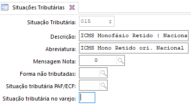 - A situação tributária de ICMS deve ser 15. Para cadastrá-la, acesse a tela Situações Tributárias (F027STR)
