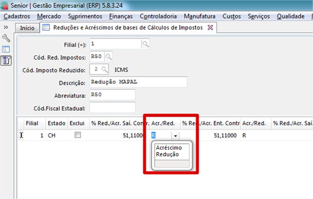 Cadastros > Mercado e Suprimentos > Parâmetros Fiscais > Reduções/acréscimos base impostos (F019TIR)