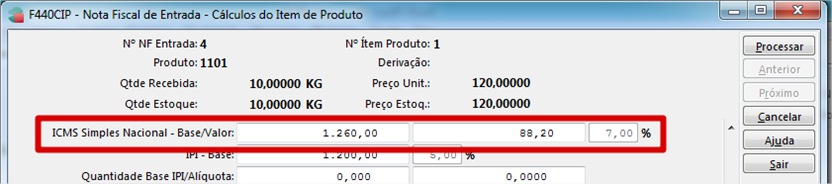 Quando o fornecedor é definido com o Código do Regime Tributário como Simples Nacional, o ICMS será calculado com a alíquota constante no campo % ICMS.