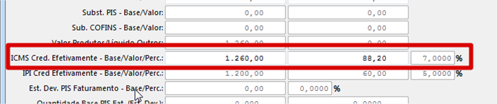 Durante a apuração do ICMS em Tributos, o sistema busca do campo “ICMS Creditado Efetivamente – Base/Valor/Percentual” da nota fiscal os valores a recuperar de ICMS.