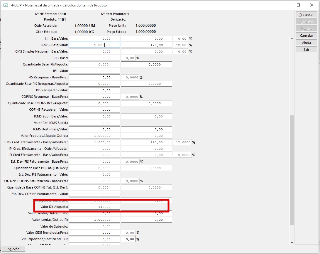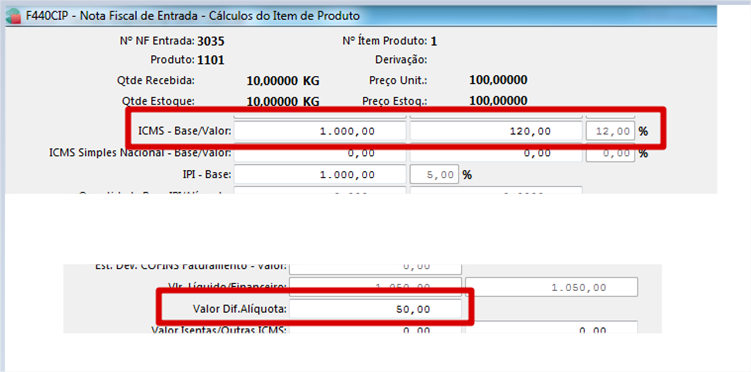 O valor é apresentado no campo Valor Dif. de Alíquota (E440IPC.VlrDfa), da tela Nota Fiscal de Entrada - Cálculos do Item de Produto (F440CIP), acessada pelo botão Cálculos da guia Produtos das telas Nota Fiscal de Entrada Agrupada (F440GNE) e Consulta de Itens de Notas Fiscais de Entrada (F441CIE).