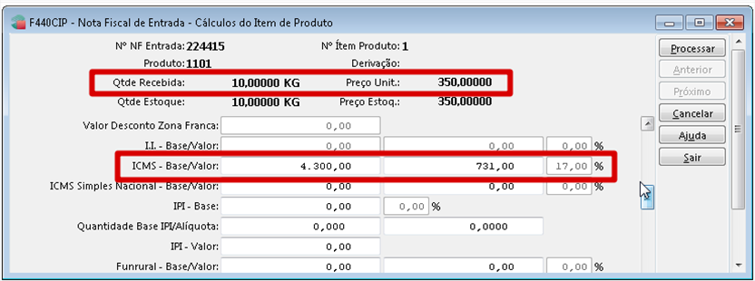 Se o sistema estiver configurado para recuperar ICMS, serão somados os valores de: ICMS isentas + ICMS outras + ICMS base + ICMS valor verificando se o total é igual ao valor líquido do item. Se não for, exibe a mensagem.