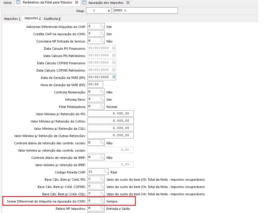 É também possível definir uma alíquota válida para todas as filiais definindo “0” como filial. A parametrização da filial “0” serve para aquelas filiais específicas que não tem parametrização definida.
