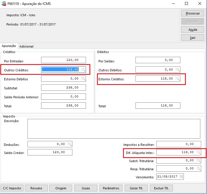 Valor ICMS Antecipação: 238,00 - 120,00 = 118,00