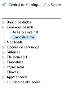 - Acesse a tela de configuração de e-mail na Central de Configurações Senior, acessada através do caminho Conexões de rede > Envio de e-mail;