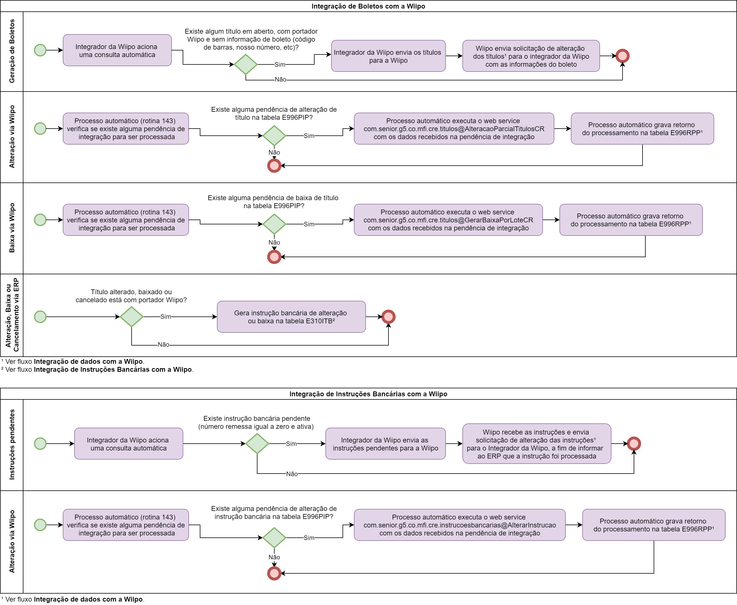 As instruções bancárias são enviadas à wiipo via consulta na base de dados do ERP por meio do integrador wiipo. São enviadas todas as instruções bancárias referentes ao portador wiipo.