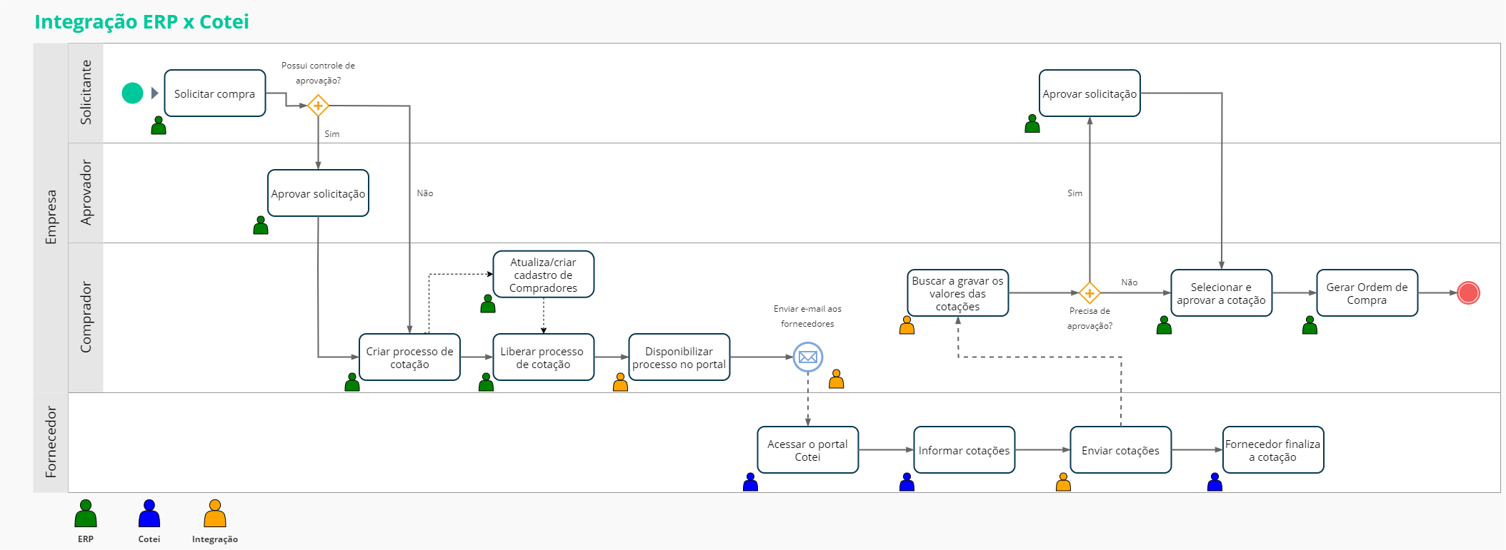 O comprador faz a cotação no ERP, que é integrada com a solução Cotei. O Cotei, então, envia um e-mail para os fornecedores sinalizados na cotação. Caso seja um fornecedor novo, ele deverá efetuar um cadastro para acessar a plataforma. Esse cadastro não possui custo e não requer nenhum tipo de instalação. Assim, o fornecedor acessa o portal do Cotei e informa seu preço, % de impostos e demais informações. Após isso, o ERP busca essas informações no Cotei, integrando com o Back Office.