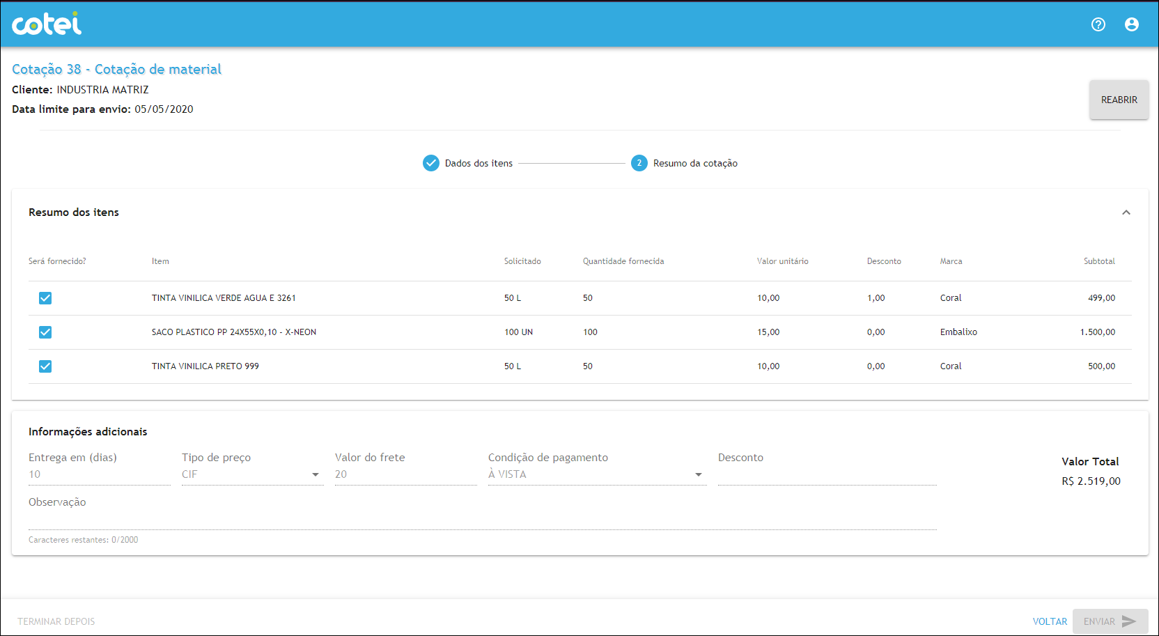 Disponível para todos os clientes do Gestão Empresarial, o Cotei automatiza as cotações e integra as respostas dos fornecedores, e com até 10 cotações mensais de forma gratuita. Além disso, todas as parametrizações necessárias para controle e integração das informações com o Cotei estão automatizadas, ou seja, no momento da atualização da versão, clientes que geram solicitações de compra estarão automaticamente parametrizados para enviar o processo de cotação.