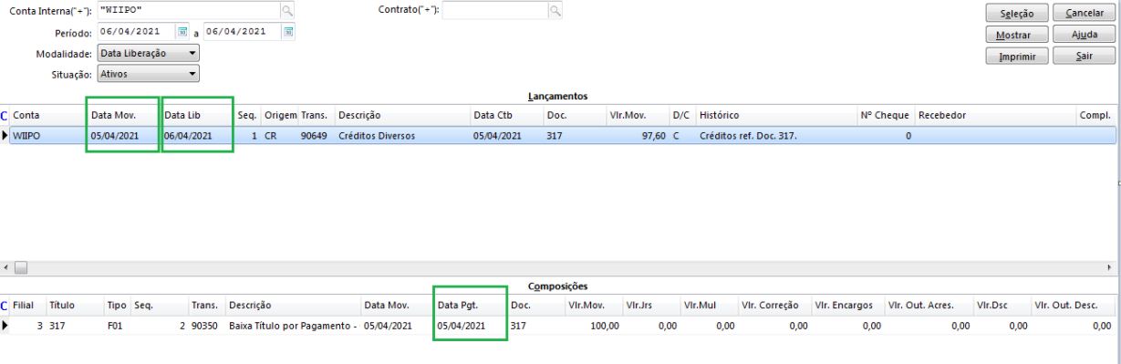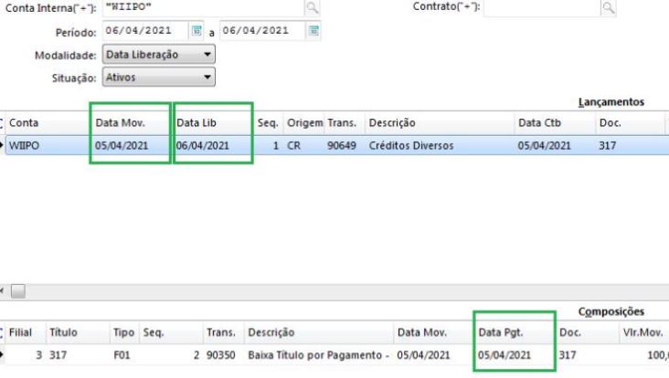 Na conciliação, as datas de pagamento, movimento e liberação são registradas da seguinte forma: