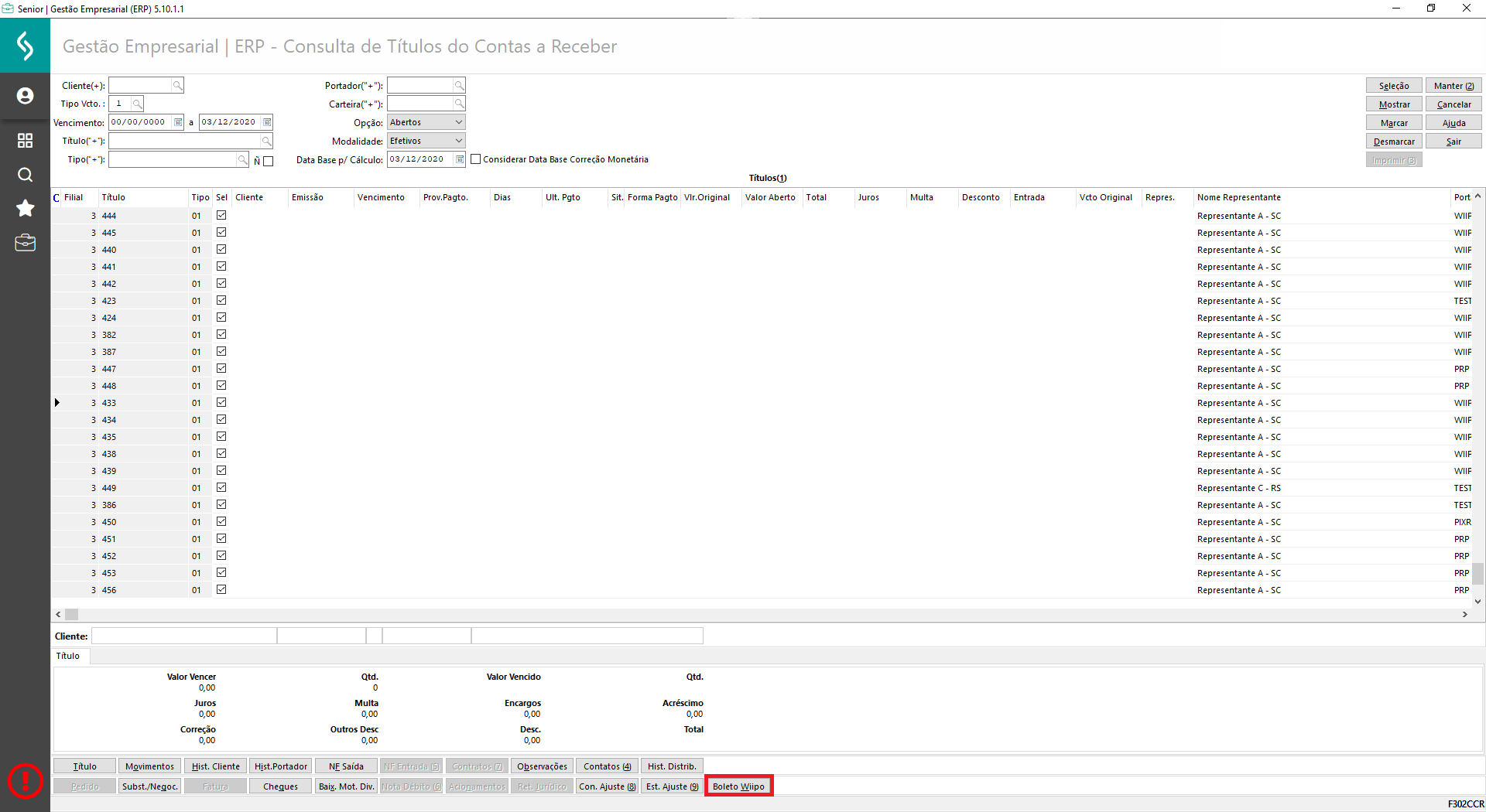 O acompanhamento dos títulos é feito por meio da tela F302CCR. Nela também é possível consultar o boleto gerado pela wiipo através do botão Boleto Wiipo: