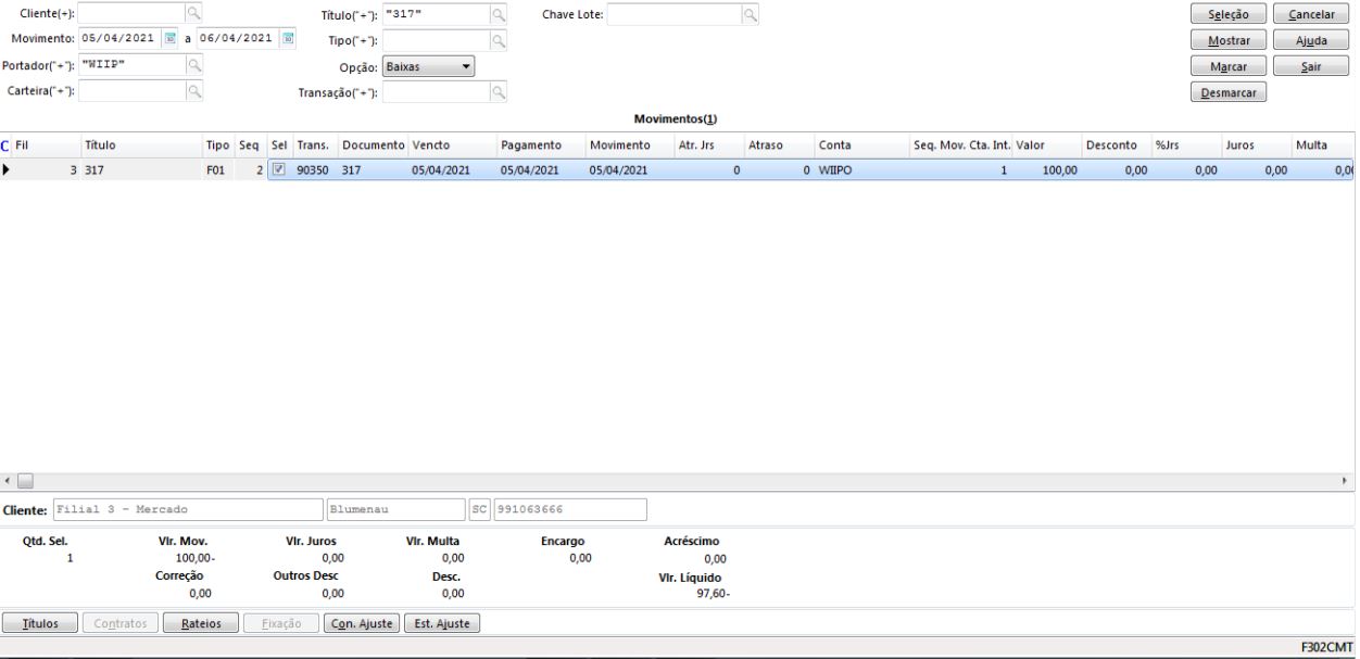 Nesse cenário, o valor da baixa do título será de R$ 100,00 e o valor líquido será de R$ 97,60. Consequentemente, o valor de movimento da tesouraria também será de R$ 97,60. A diferença entre o valor do título e o valor líquido corresponde ao valor da taxa (nesse caso R$ 2,40) que fica gravada na tabela de movimentação de títulos no campo Valor de Despesa de Cobrança (E301MCR.VlrDcb).