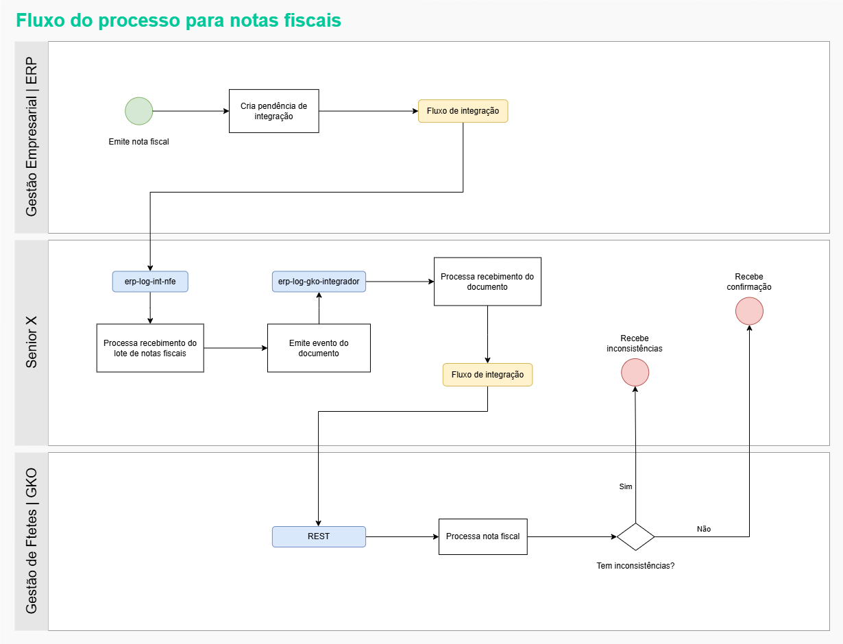 Primeiramente, define-se os tipos de frete a serem considerados para o cálculo. Em seguida, quando a nota fiscal for fechada (entrada) ou autorizada (saída), uma pendência de integração será gerada para o processamento. Após a conclusão da integração, será possível consultar o histórico completo das ocorrências dos documentos no Monitor GKO, por meio da plataforma Senior X.