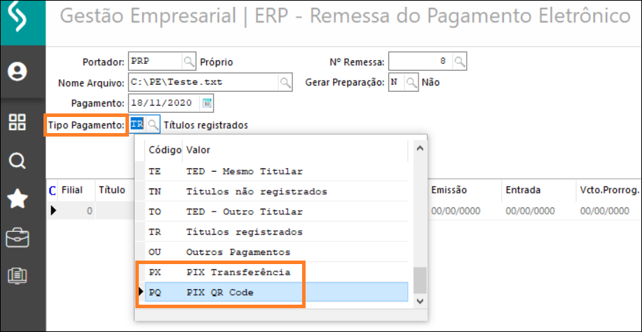 Para facilitar a identificação dos tipos de pagamento PX e PQ, que precisam ser enviados separadamente quando houver outros tipos de pagamento na tela, sugerimos que você use o campo Tipo Pgt. para ordenar os registros da grade.