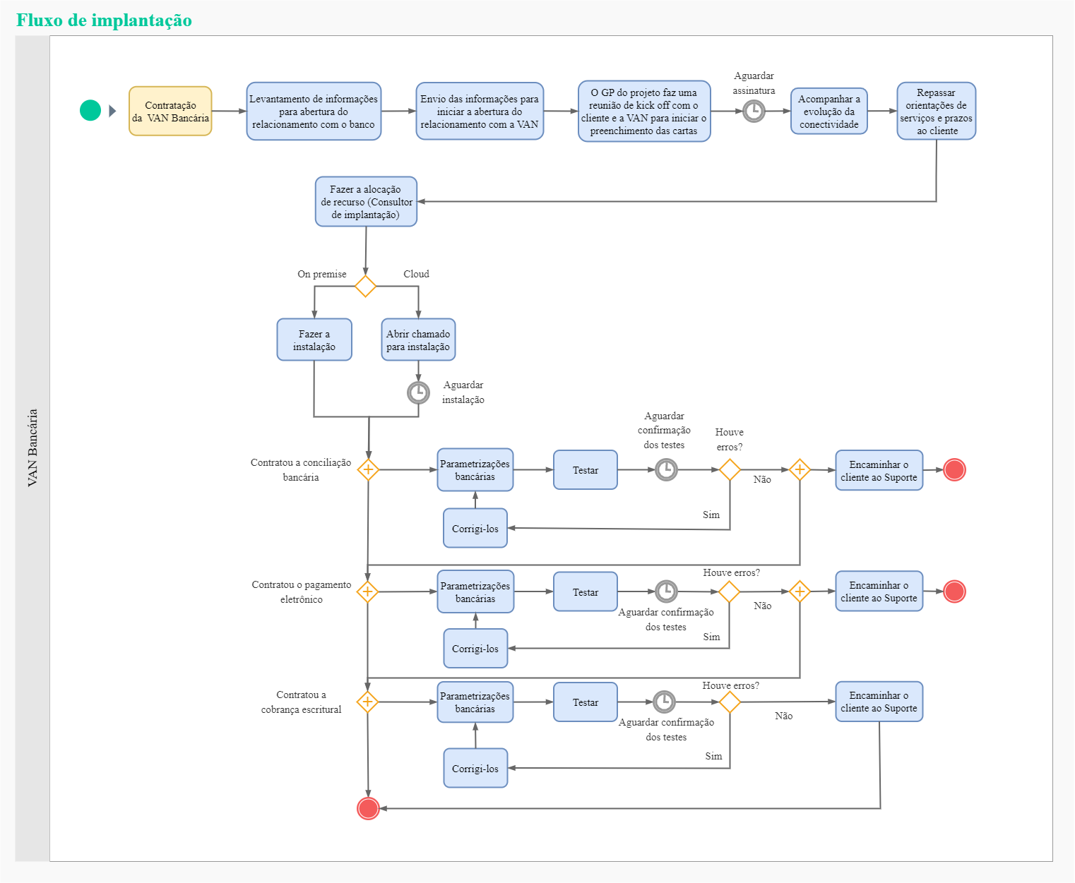 - É feita então uma reunião de kick off com o cliente e a VAN Bancária para abertura do processo de relacionamento com o banco.