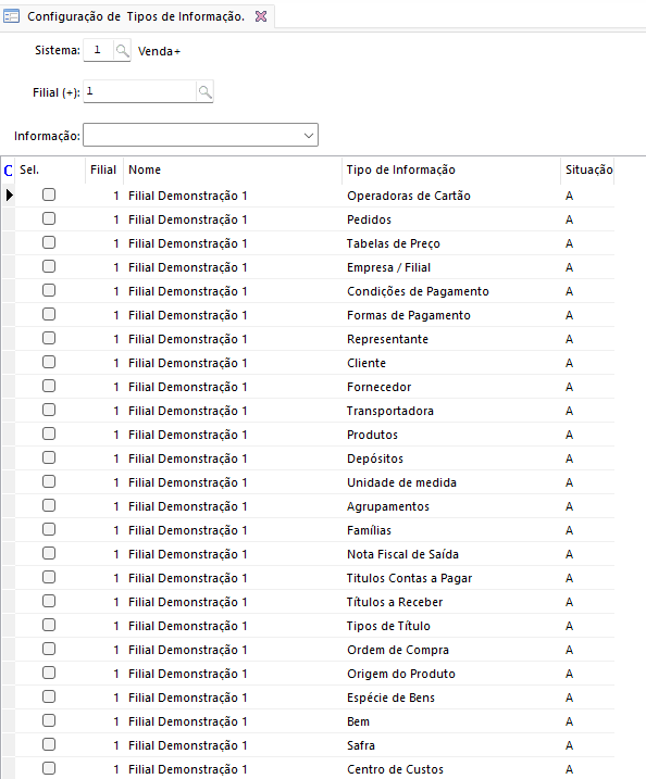 - Na grade disponível, devem ser marcados os registros desejados para a integração. Estes registros devem estar com a situação igual a A- Ativo.