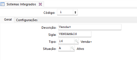 - Informar a sigla do sistema a ser integrado. Neste caso, deverá ser VENDAMAIS conforme exemplo;