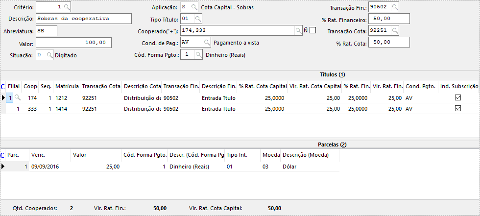 2. O campo Vlr. Rat. Cota Capital é preenchido com o resultado de: % Rat. Cota * Valor da distribuição / quantidade de cooperados do movimento.