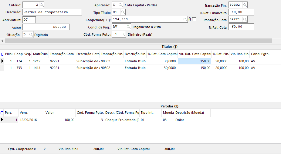 10. Informe a Transação Cota. e o % Rat. Cota da operação. A quantidade informada neste campo será distribuída entre os cooperados selecionados, como cota capital. É possível subscrever (perdas) ou integralizar (sobras) esta quantidade.