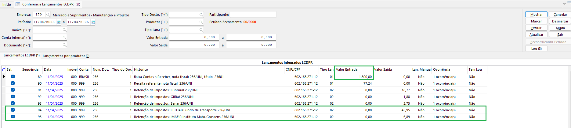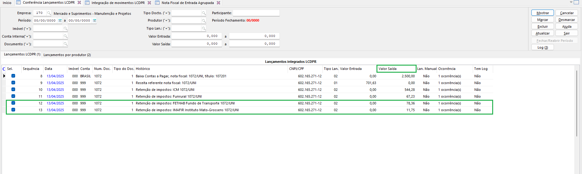 - Quando as Notas Fiscais de Saída possuírem valores retidos, os mesmos irão aparecer nos movimentos do LCDPR como despesa e receita.
